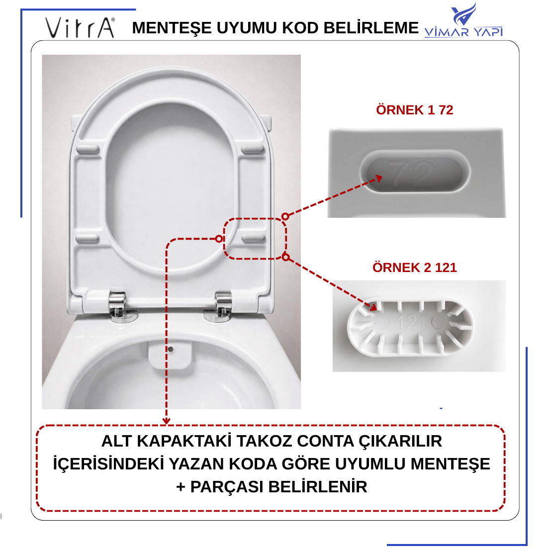 KOD UYUMLULUK HAKKINDA:Alt kapakta 4 Ad Conta takoz var takozu çıkarıp yuva içinde (Örnek1 121) (Örnek2 85 gibi) Kodlar ile menteşenin uyumluluğu belirlenir |