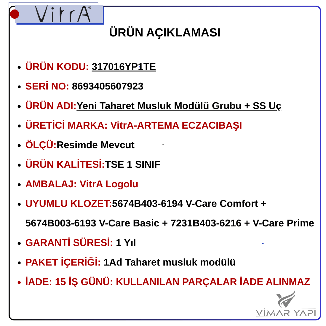 317016YP1TE V-CARE Yeni Taharet Musluk Modülü Grubu + SS Uç