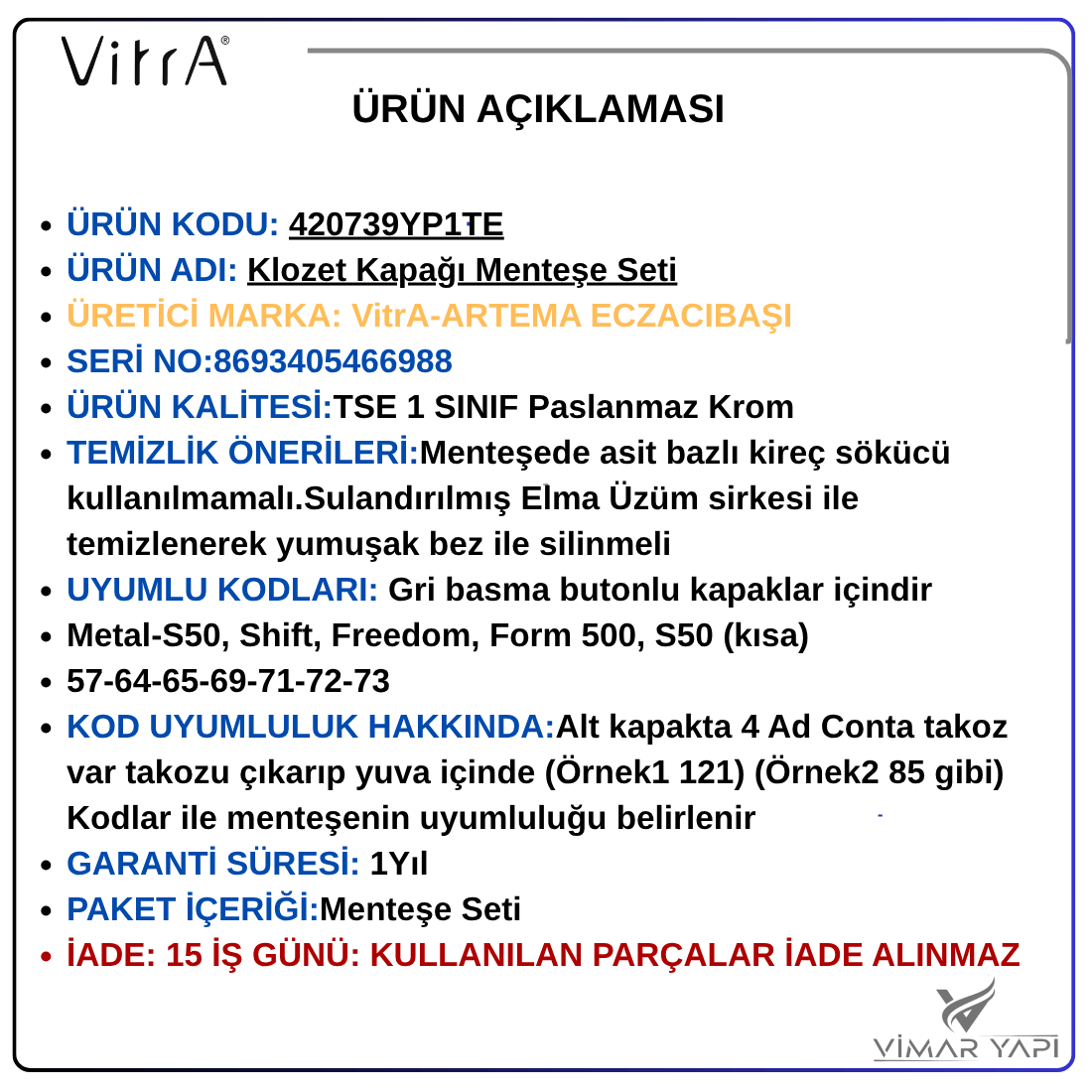 İADE: 15 İŞ GÜNÜ: KULLANILAN PARÇALAR İADE ALINMAZ |