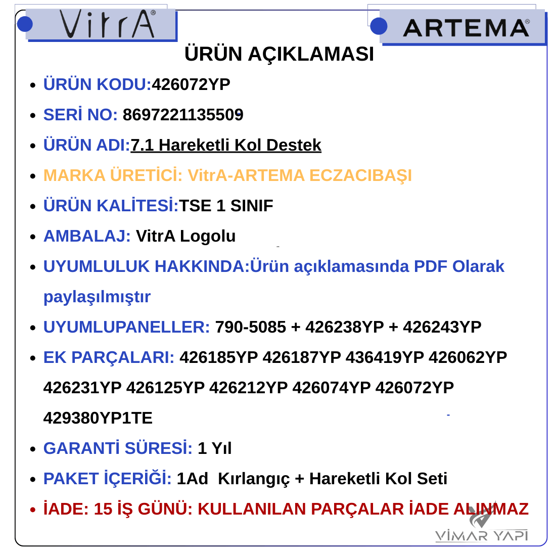 ÜRÜN KODU:426072YP n nSERİ NO: 8697221135509 n nÜRÜN ADI:7.1 Hareketli Kol Destek n nMARKA ÜRETİCİ: VitrA-ARTEMA ECZACIBAŞI n nÜRÜN KALİTESİ:TSE 1 SINIF n nAMBALAJ: VitrA Logolu n nUYUMLULUK HAKKINDA:Ürün açıklamasında PDF Olarak paylaşılmıştır n nUYUMLUPANELLER: 790-5085 + 426238YP + 426243YP n nEK PARÇALARI: 426185YP 426187YP 436419YP 426062YP 426231YP 426125YP 426212YP 426074YP 426072YP 429380YP1TE n nGARANTİ SÜRESİ: 1 Yıl n nPAKET İÇERİĞİ: 1Ad Kırlangıç + Hareketli Kol Seti n nİADE: 15 İŞ GÜNÜ: KULLANILAN PARÇALAR İADE ALINMAZ n nhttps://www.vitra.com.tr/servisler-ve-satis-noktalari/ n nhttps://vitraartemayedekparca.com/wp-content/uploads/2023/08/781-REZERVUAR-YEDEK-PARCA-UYUM-TABLOSU-1-1-1.pdf121111.pdf5555.pdf n n