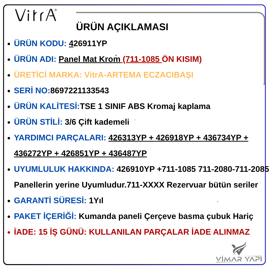 - ÜRÜN ADI: Panel Mat Krom (711-1085 ÖN KISIM)