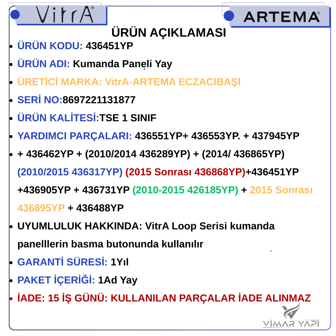 ÜRÜN KODU: 436451YP n nÜRÜN ADI: Kumanda Paneli Yay n nÜRETİCİ MARKA: VitrA-ARTEMA ECZACIBAŞI n nSERİ NO:8697221131877 n nÜRÜN KALİTESİ:TSE 1 SINIF n nYARDIMCI PARÇALARI: 436551YP+ 436553YP. + 437945YP+ 436462YP + (2010/2014 436289YP) + (2014/ 436865YP) (2010/2015 436317YP) (2015 Sonrası 436868YP)+436451YP +436905YP + 436731YP (2010-2015 426185YP) + 2015 Sonrası 436895YP + 436488YP n nUYUMLULUK HAKKINDA: VitrA Loop Serisi kumanda panelllerin basma butonunda kullanılır n nGARANTİ SÜRESİ: 1Yıl n nPAKET İÇERİĞİ: 1Ad Yay n nİADE: 15 İŞ GÜNÜ: KULLANILAN PARÇALAR İADE ALINMAZ n nhttps://www.vitra.com.tr/servisler-ve-satis-noktalari/ n n