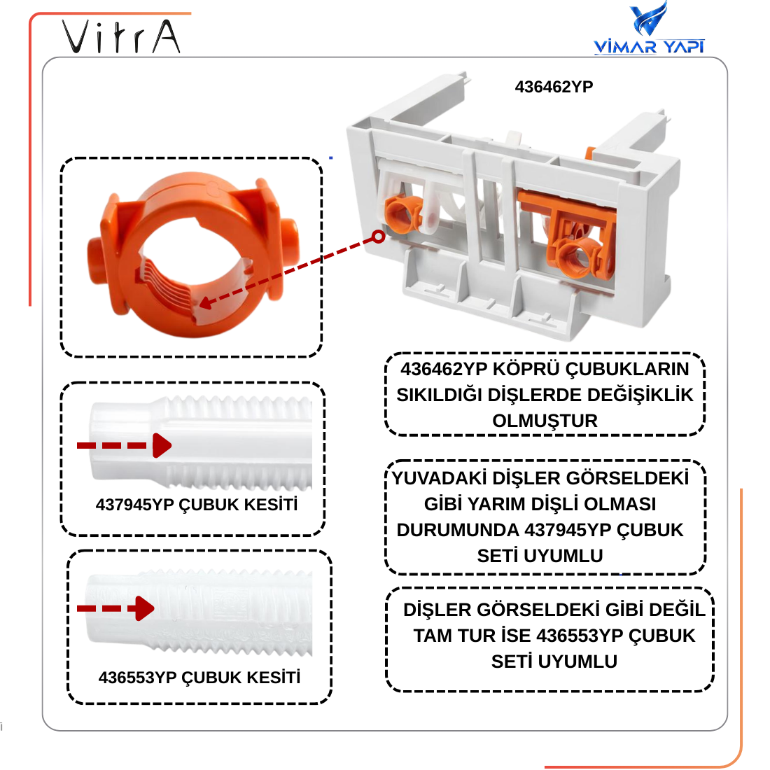 UYUMLU EK PARÇASI:436462YP Çubuğun sıkıldığı Klıps yuvalarda değişim olmuştur NOT:Çubuğun sıkıldığı dişler çapraz yarım diş olduğuna dikkat edilmelidir Görselde teknik bilgi verilmiştir |