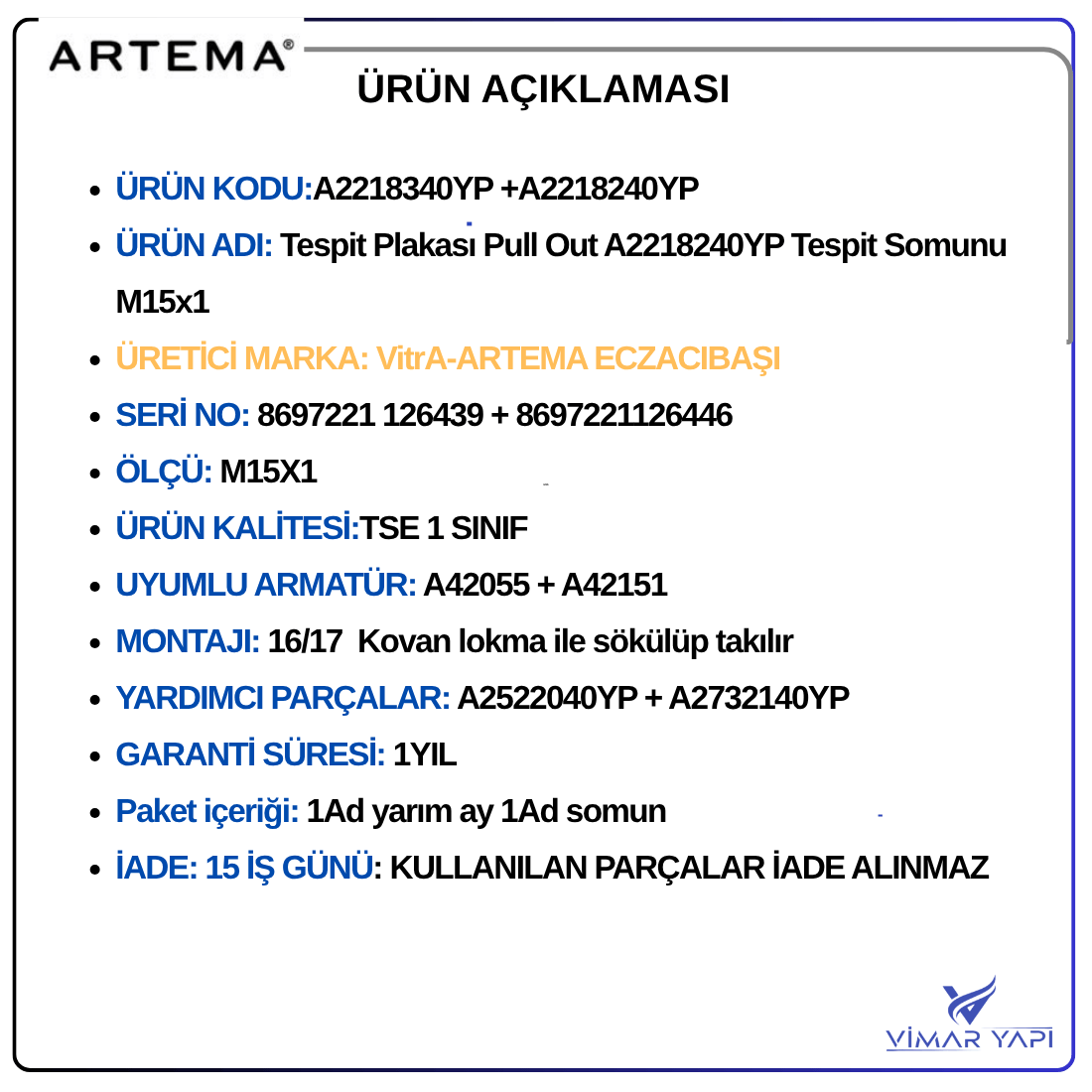 A2218340YP Tespit Plakası Pull Out A2218240YP Tespit Somunu M15x1