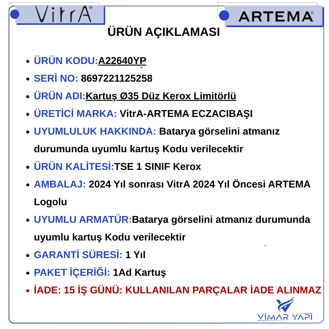 AMBALAJ: 2024 Yıl sonrası VitrA 2024 Yıl Öncesi ARTEMA Logolu |