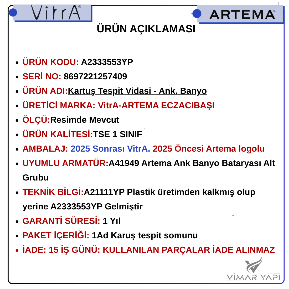 A2333353YP Kartuş Tespit Vidasi Ank. Banyo (A21111YP Yerine)