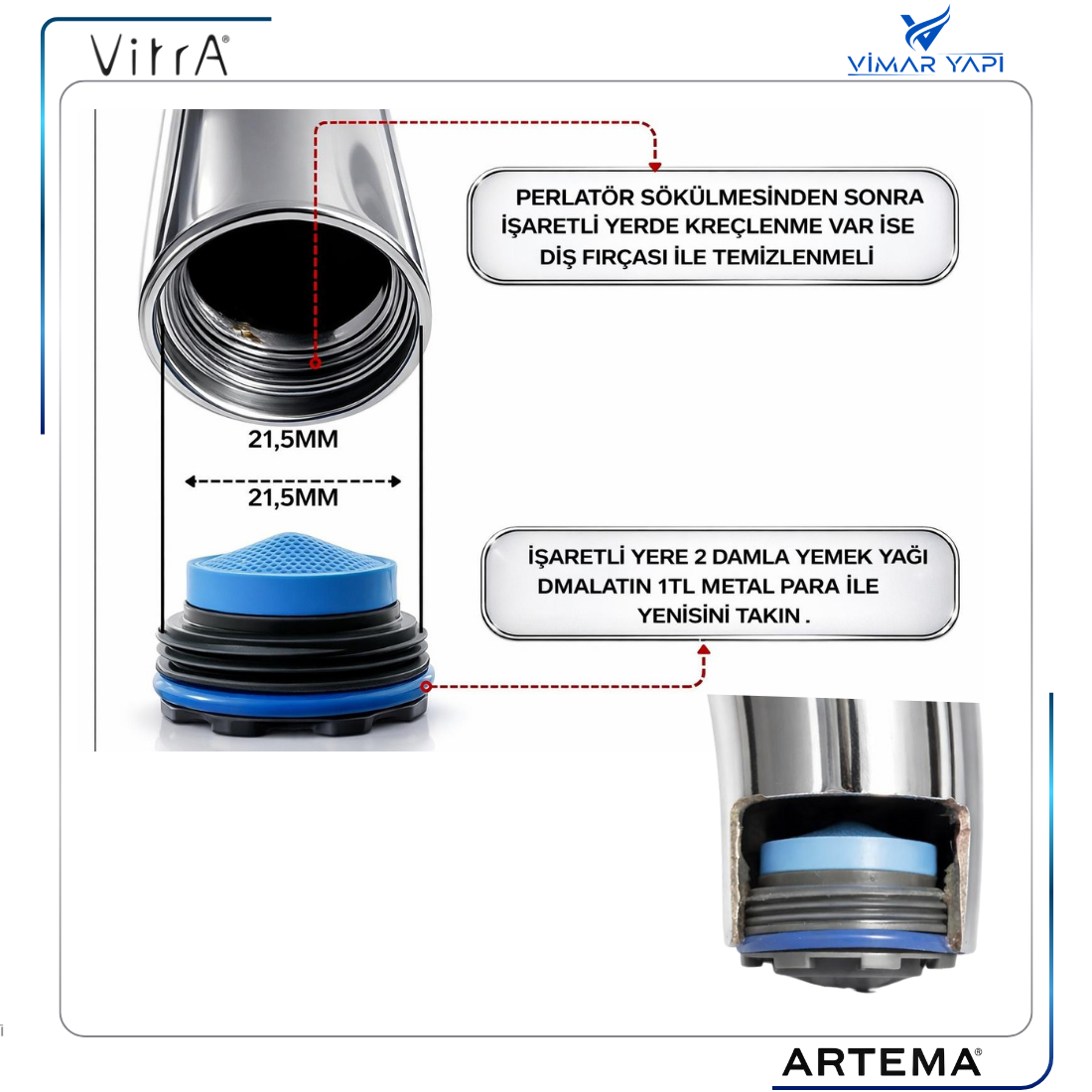 UYUMLULUK HAKKINDA: Perlatörün takıldığı batarya çıkış borusundaki diş içten dişli 21,5mm ölçüde olmalıdır.Anahtar yok ise düz torna vida ile kırarak çıkarabilirsiniz.Perlatörün söküldüğü yuvada kireç var ise temizlenip yenisi 1TL Metal para ile takılabilir. |