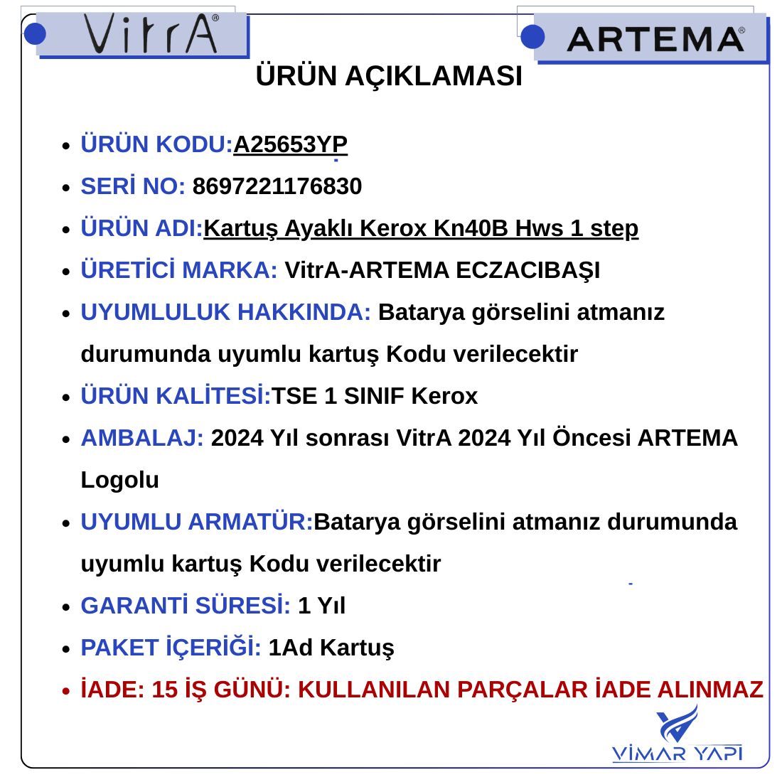 - AMBALAJ: 2024 Yıl sonrası VitrA 2024 Yıl Öncesi ARTEMA Logolu n