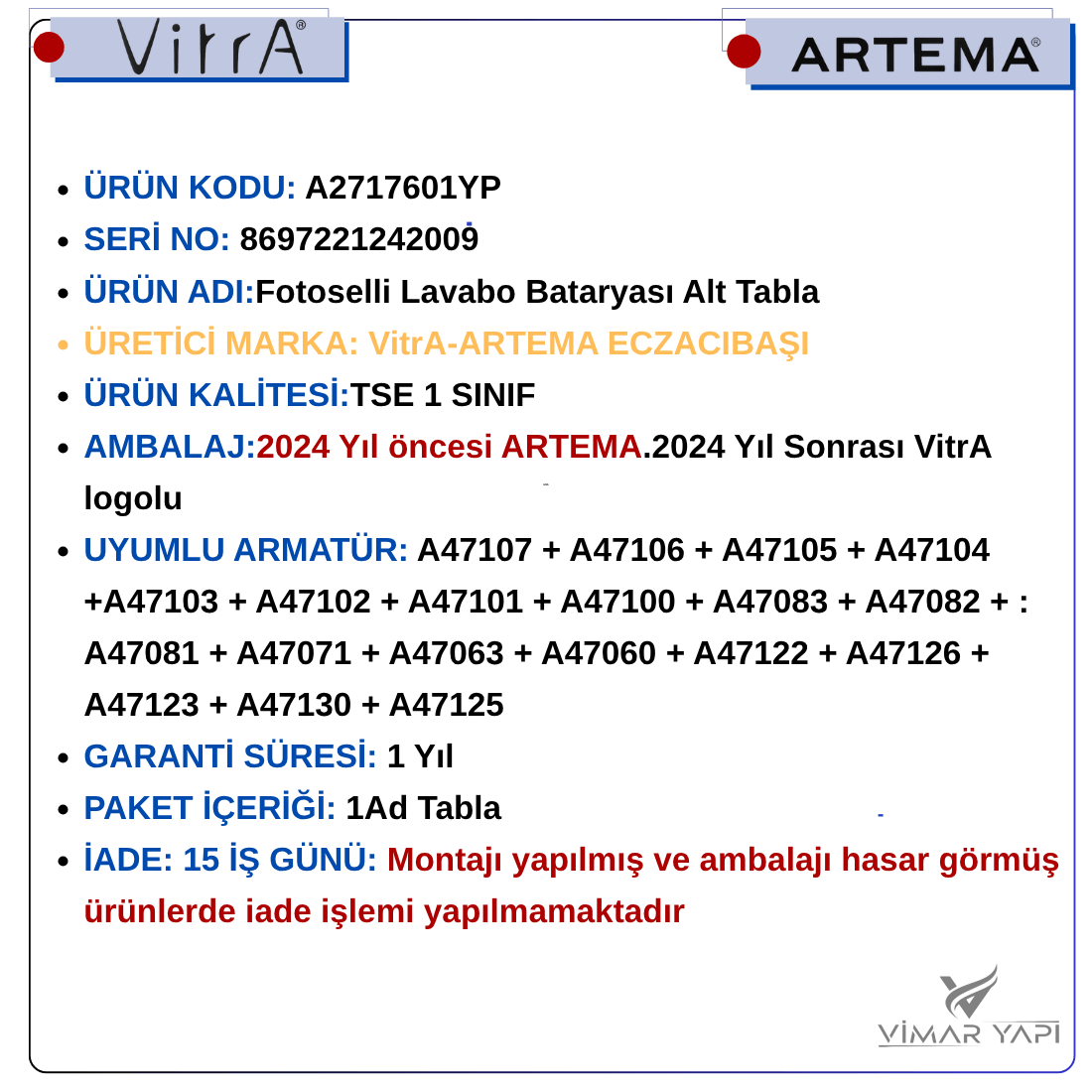 - AMBALAJ:2024 Yıl öncesi ARTEMA.2024 Yıl Sonrası VitrA logolu n