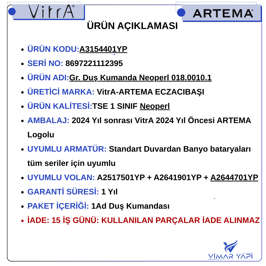 A3154401YP VitrA ARTEMA.Duş Kumanda Neoperl 018.0010.1