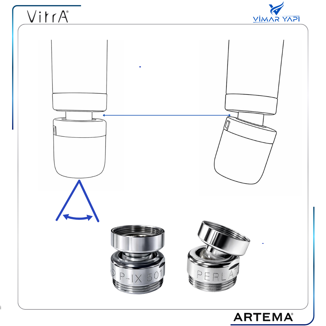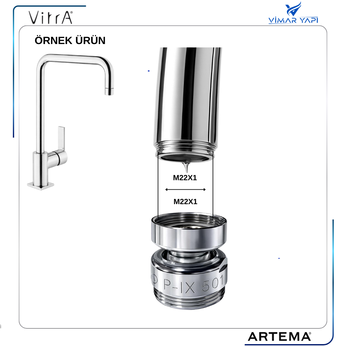 MONTAJ:Mevcut M22X1 Perlatör ile kullandığınız ürünün ucundaki perlatör çıkarılır Mafsal M22X1 Dıştan dişli çıkış ucuna takılır Mafsal ucuna sökülen M22X1 Perlatör takılır |