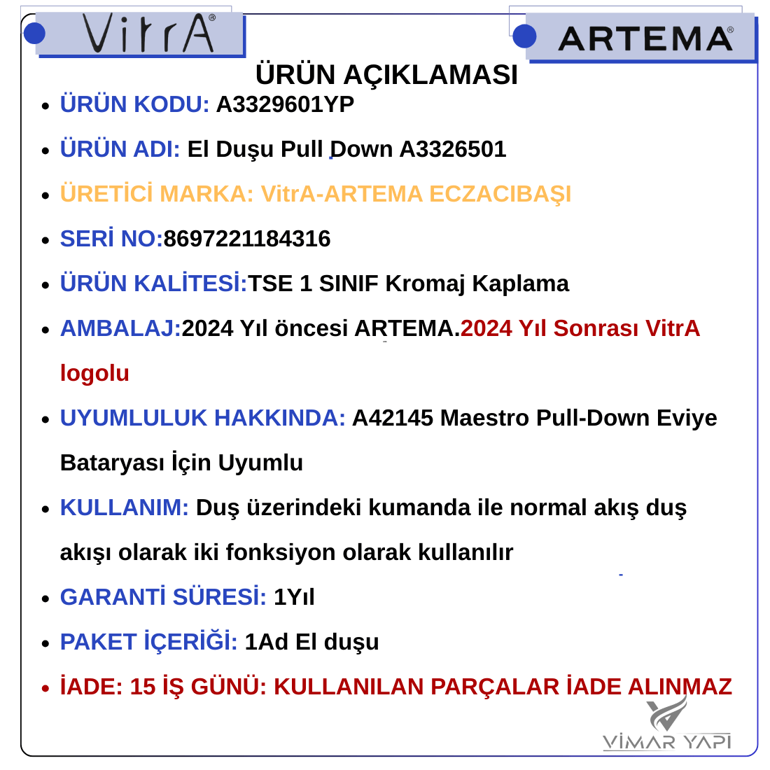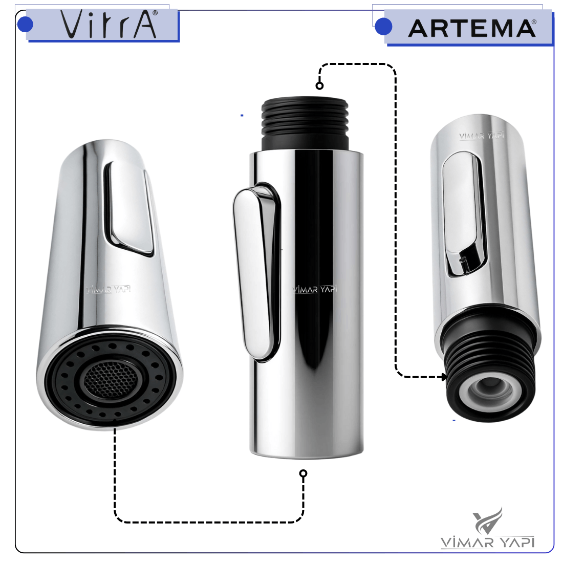 ÜRÜN KODU: A3329601YP n nÜRÜN ADI: El Duşu Pull Down A3326501 n nÜRETİCİ MARKA: VitrA-ARTEMA ECZACIBAŞI n nSERİ NO:8697221184316 n nÜRÜN KALİTESİ:TSE 1 SINIF Kromaj Kaplama n nAMBALAJ:2024 Yıl öncesi ARTEMA.2024 Yıl Sonrası VitrA logolu n nUYUMLULUK HAKKINDA: A42145 Maestro Pull-Down Eviye Bataryası İçin Uyumlu n nKULLANIM: Duş üzerindeki kumanda ile normal akış duş akışı olarak iki fonksiyon olarak kullanılır n nGARANTİ SÜRESİ: 1Yıl n nPAKET İÇERİĞİ: 1Ad El duşu n nİADE: 15 İŞ GÜNÜ: KULLANILAN PARÇALAR İADE ALINMAZ n nhttps://www.vitra.com.tr/servisler-ve-satis-noktalari/ n