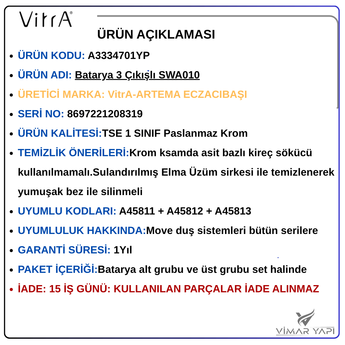 - İADE: 15 İŞ GÜNÜ: KULLANILAN PARÇALAR İADE ALINMAZ n