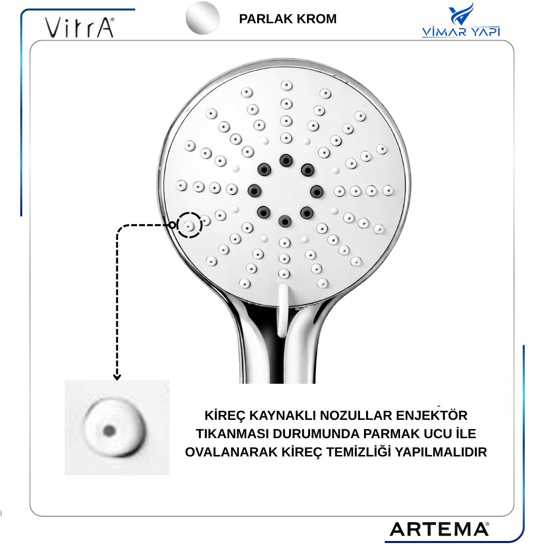 TEMİZLİK ÖNERİSİ:Krom yüzeyler Sulandırılmış elma,Üzüm Sirkesi ile temizlenmelidir.Su akış nozulları kireç kaynaklı tıkanacağı için parmak ucu ile ovalanarak temizlenmeli. |