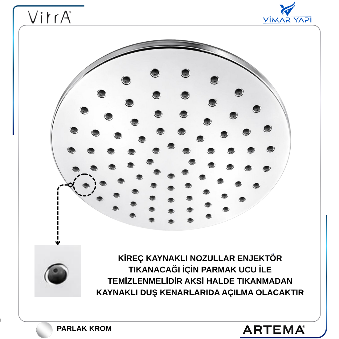 TEMİZLİK ÖNERİSİ:Krom yüzeyler Sulandırılmış elma,Üzüm Sirkesi ile temizlenmelidir.Su akış nozulları kireç kaynaklı tıkanacağı için parmak ucu ile ovalanarak temizlenmeli. |