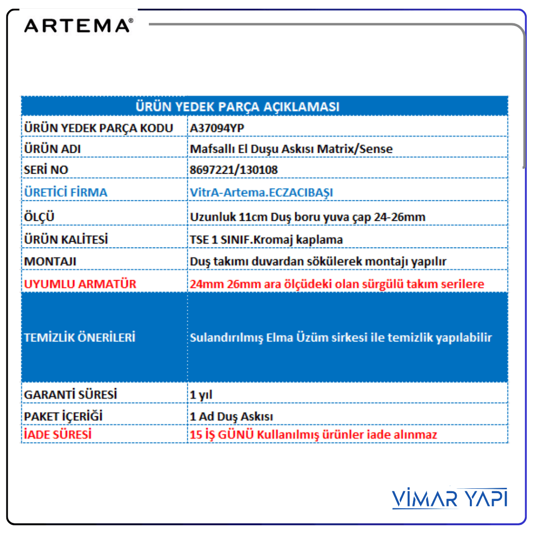 Satın alma işleminizle ilgili yardıma ihtiyacınız varsa veya uygun bir parçayı satın alma/tanımlama konusunda tavsiyeye ihtiyacınız varsa, lütfen bize vimar@vitrayetkiliservis.com adresinden whatsApp üzerinden ürünün tamamının ve gerekli parçanın resmini içeren bir e-posta gönderin. Operatörlerimizin tamamı sektörde deneyimlidir ve sorularınız için size yardımcı olmaktan mutluluk duyacaktır