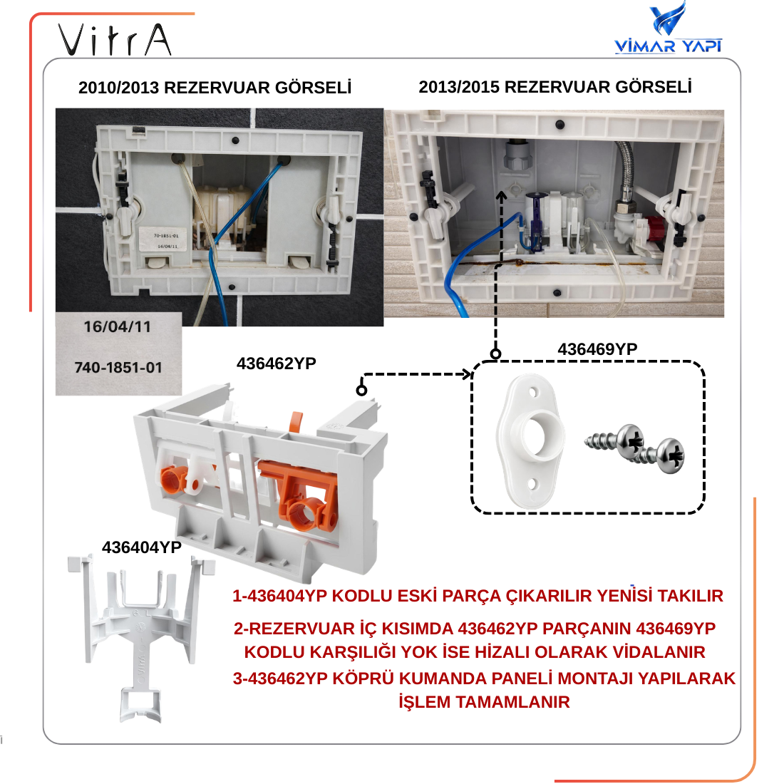 436462YP Köprünün karşılığı gömme rezervuarın gövdesinde mevcut Değil ise 436469YP Vida ile montajlanmalıdır.Detay resimlerde mevcuttur. |